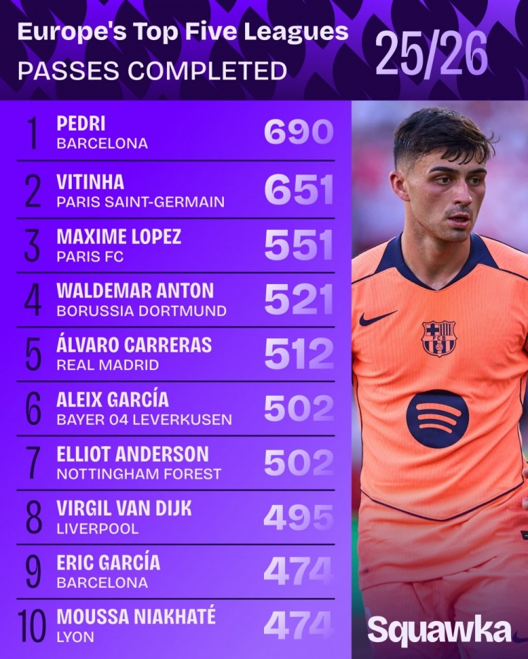 五大职业联赛 球员传送球 榜:佩德里690次居首,维蒂尼亚651次次之