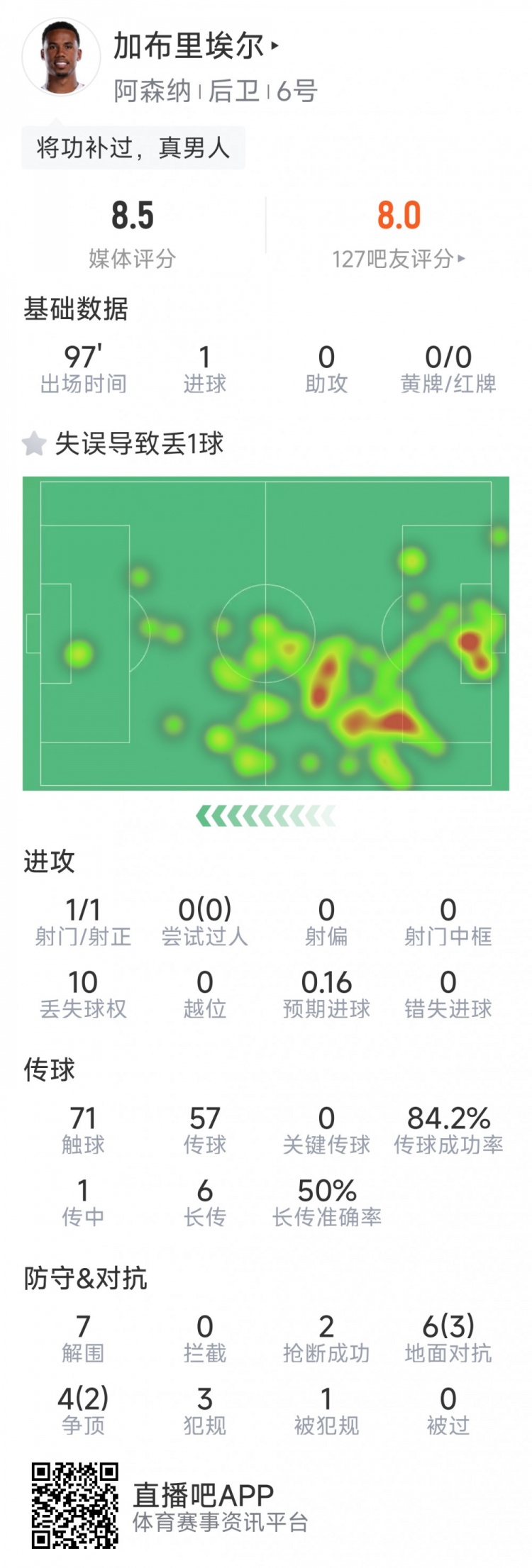 1月4日讯 在本轮英超,阿森纳3-2击败伯恩茅斯,加布里埃尔本场先是错误 导致失球,苏超直播随后破守门员功补过,以下为他在本场数据: