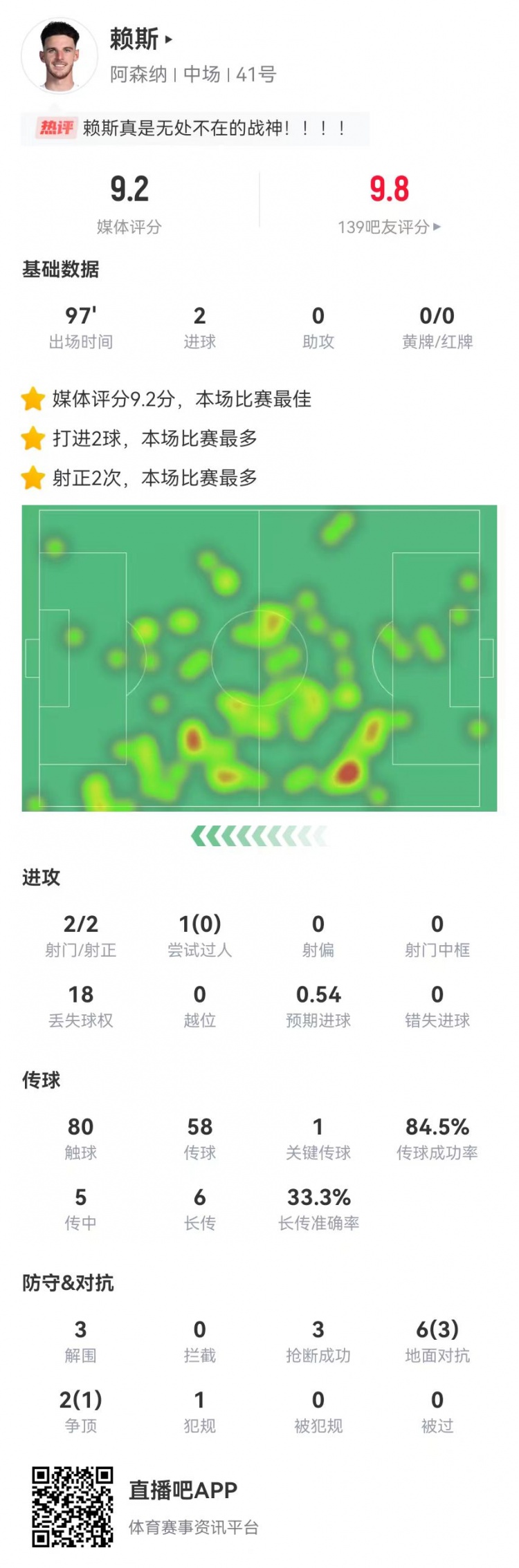 赖斯本场2射进2球 3解围3抄截 +8对峙 4成功 获评9.2分全场最高