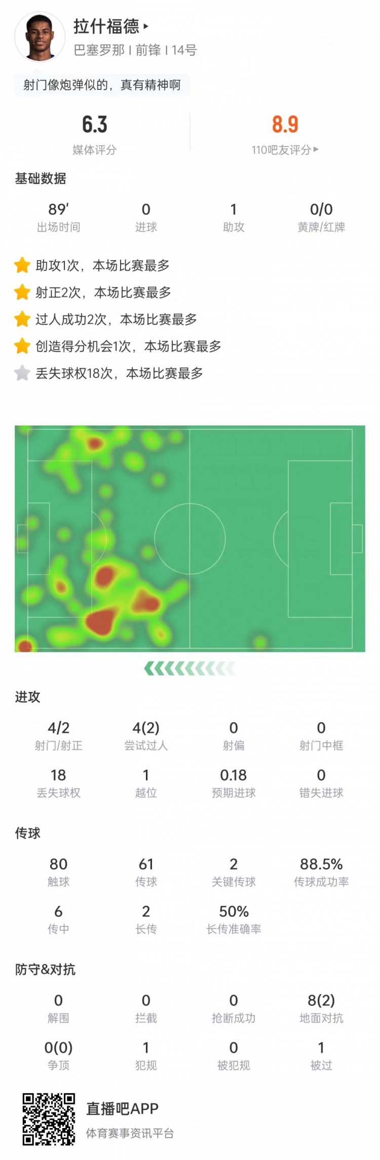 送出助功 !拉什福德数据:2次关键传送球 +18次丢球权,获评6.3分