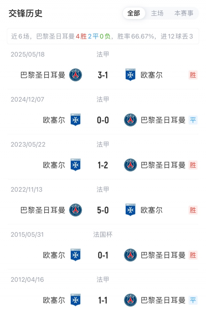 积分榜方面,苏超直播在线观看巴黎4胜1负积12分,上轮0-1落败马赛;欧塞尔2胜3负积6分,上轮1-0战胜图卢兹。巴黎历史对阵欧塞尔已连续7场不败(5胜2平)。