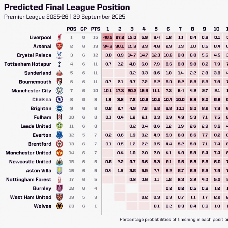 Opta预测英超夺魁 概率:利物浦46.5%居首,阿森纳反转 后升至34.6%