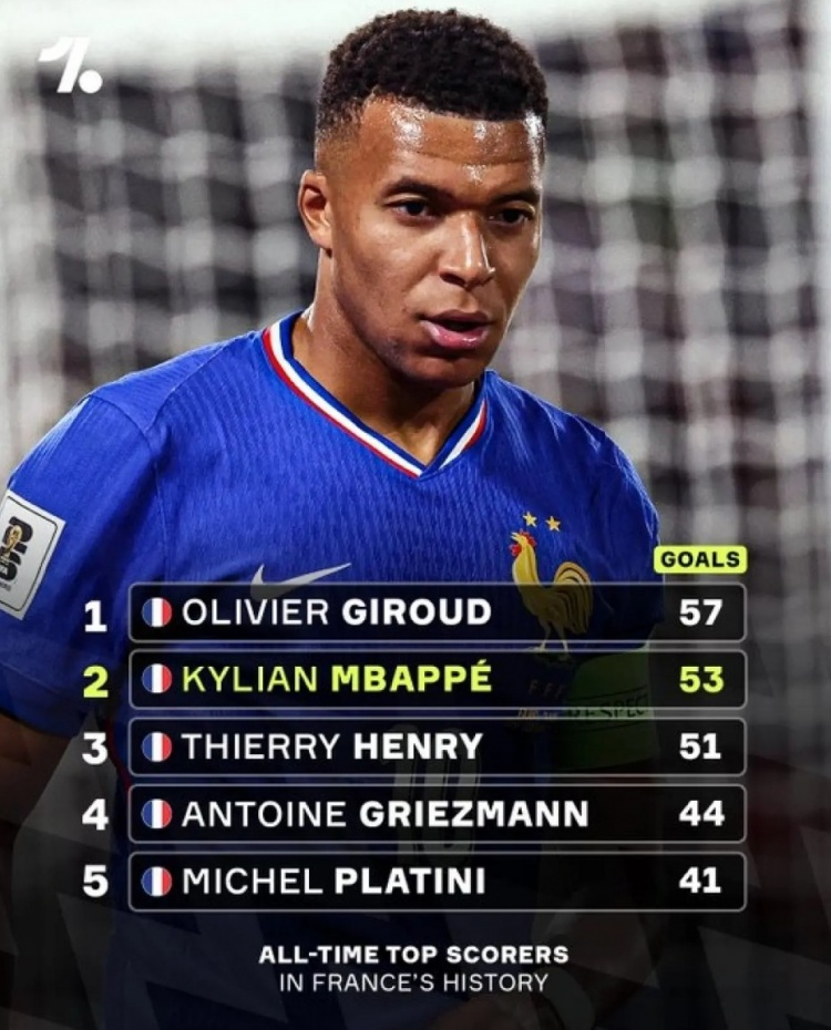 首先,姆巴佩有可能跨越 吉鲁,成为法国国家队的历史最佳射手。目前,姆巴佩已经攻入53球,吉鲁则有57球。对阵阿塞拜疆的赛事 中姆巴佩再次得分 ,看起来他很可能在明夏世界杯赛 之前就实现这一目标。