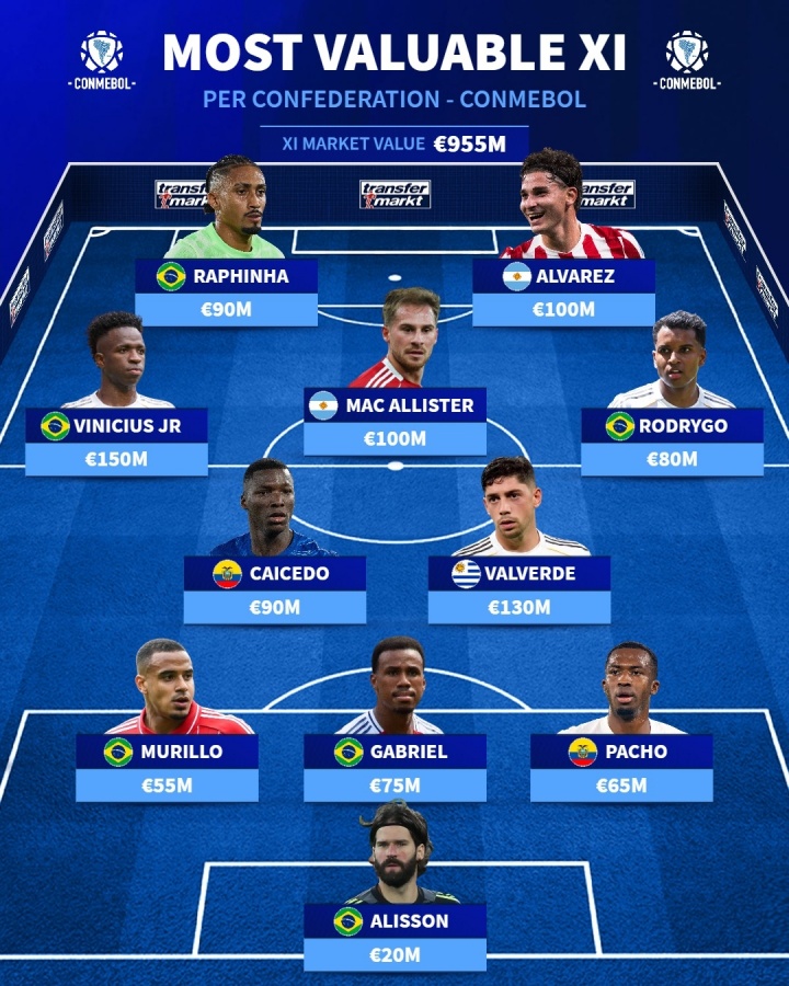 总身价9.55亿欧!南美足联最贵阵:维尼修斯领衔,皇马3人红军2人