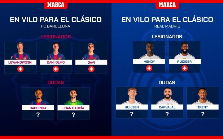 10人伤缺?皇马巴萨缺席月底德比人员:巴萨3伤2疑,皇马2伤3疑