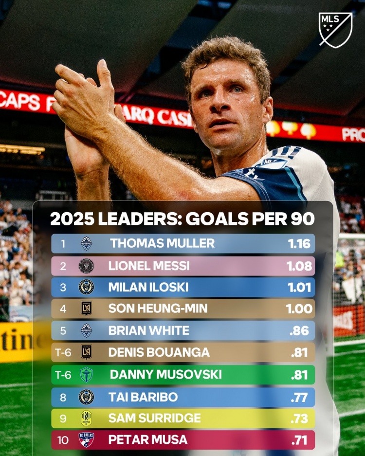 本赛季美职联每90分钟得分 榜:穆勒1.16球居首,梅西1.08球次席