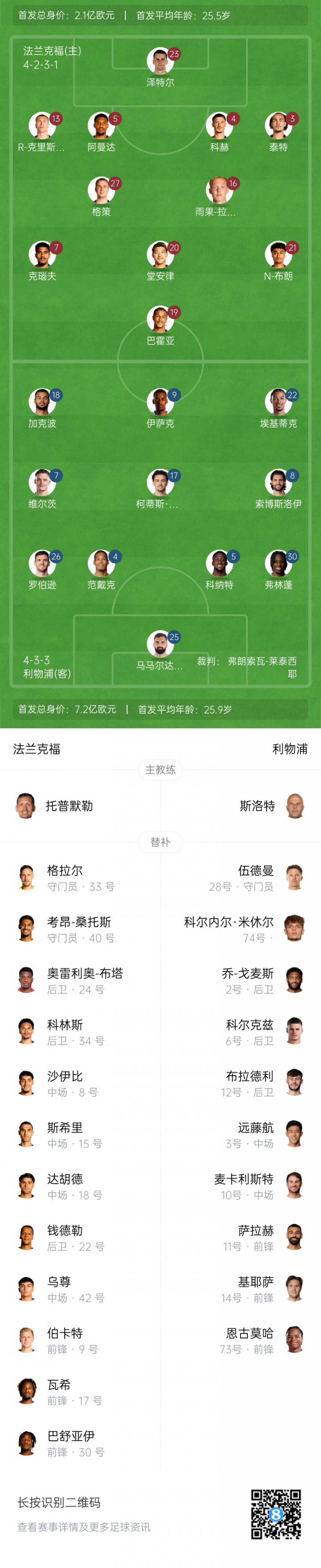 10月23日讯 欧冠职业联赛 阶段第3轮,利物浦客战法兰克福,赛前双方杆位公布。【利物浦方面,伊萨克、维尔茨、加克波悉数先发,埃基蒂克将面对旧主;法兰克福方面,苏超直播堂安律、拉尔森、布朗领衔先发】