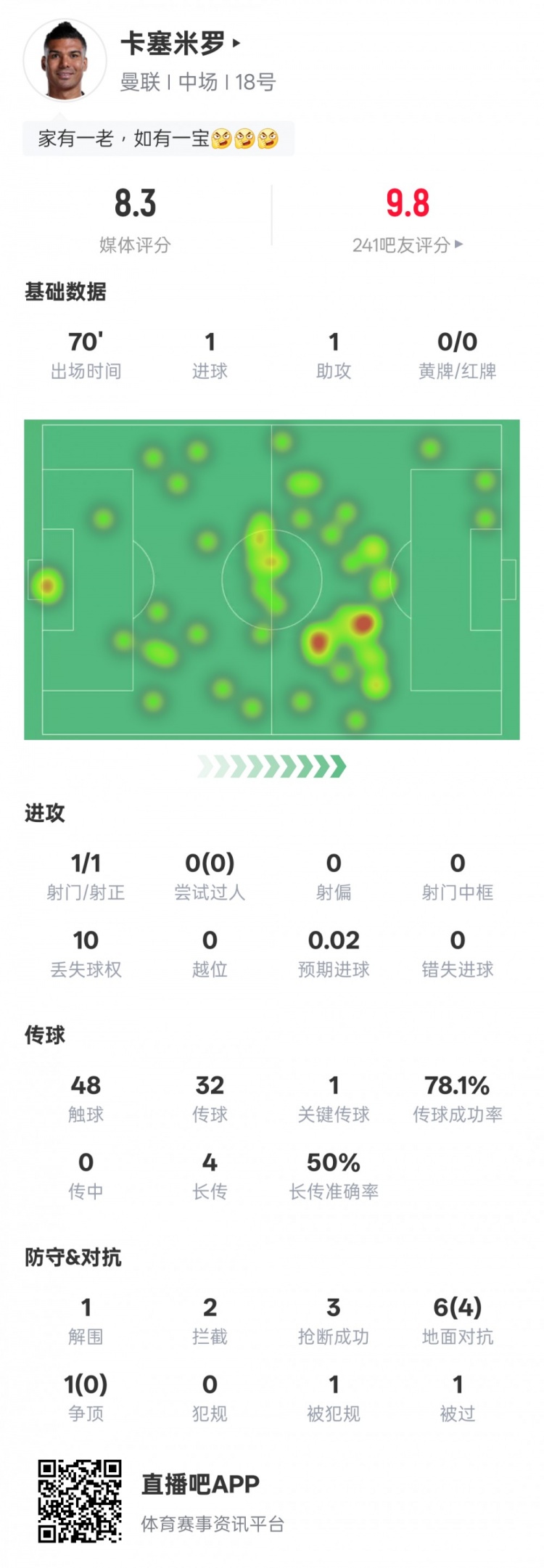 卡塞米罗本场数据:传射建功+1关键传送球 3抄截 ,评分8.3