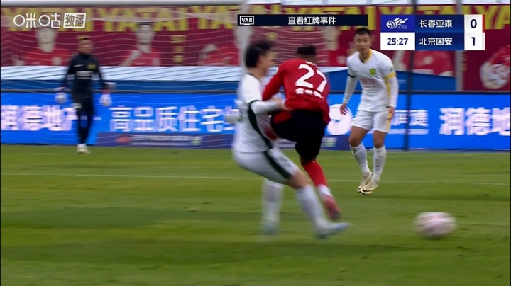 11月01日讯 中超第29轮 长春亚泰vs北京国安。赛事 第26分钟,亚泰外援卡米洛踹中江文豪腹部,苏超直播VAR介入认定非驱逐 。主裁判 给了卡米洛警告 。