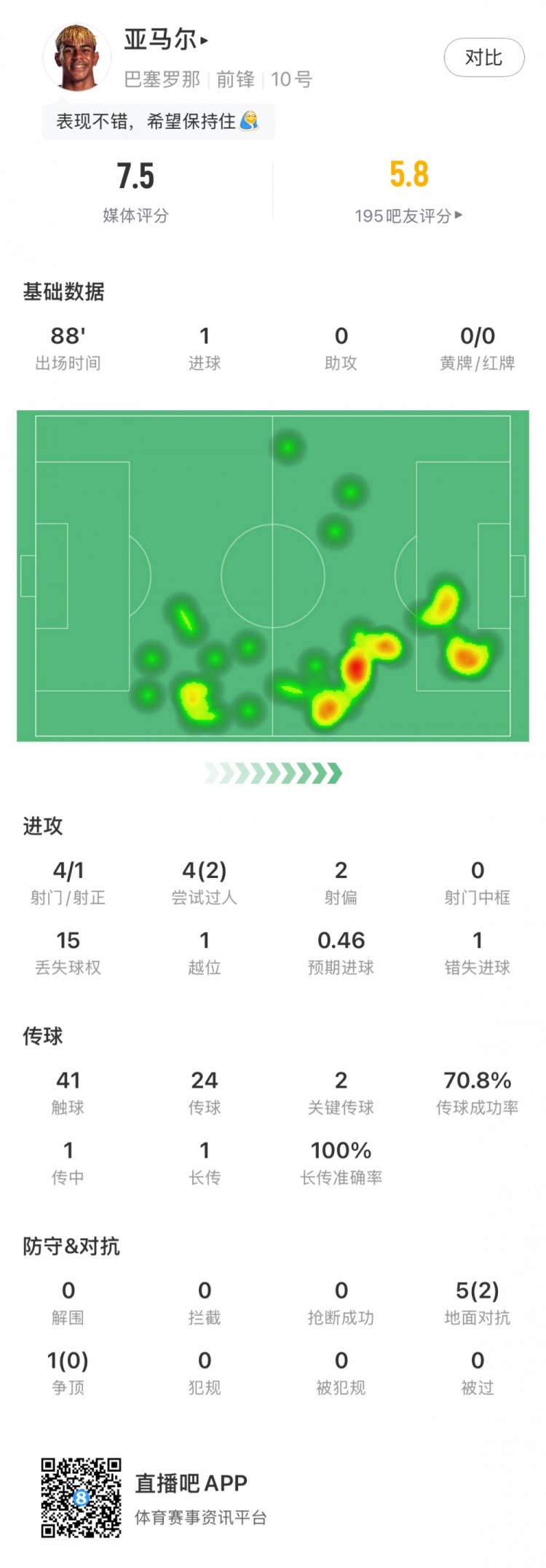 亚马尔数据:4射1正1得分 ,2关键传送球 ,预期得分 0.46,评分7.5