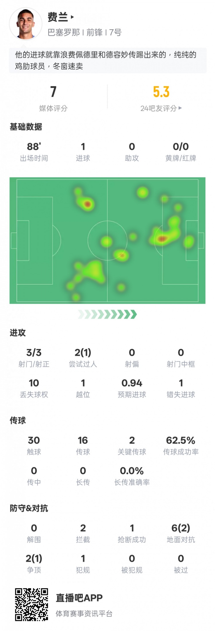 费兰本场数据:1得分 2关键传送球 1过人成功1错失得分 机会,评分7.0